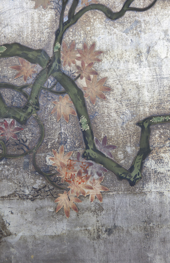 The painter is Kanrin. But we don't know his details. However, we can understand he was in Tosa School from how to paint the leaves and chrysanthemums. And the screen has one more mysterypoint. There are some same stamp "Syurin Bunko" pushed in many places. Whether a past owner pushed it or is it the play of the child? . It is an interesting mystery.