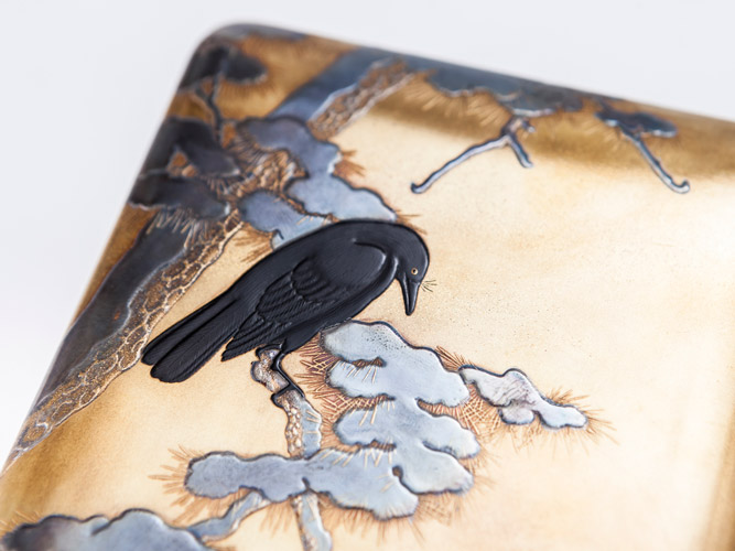 At first I was attracted by the design of a crow. And then I noticed that the rising sun can be seen different color by several angles. Color of the gold and fine Makie work of crow are not usual level and all is of fine quality. It is simple, but is the good work which is attracted whenever I look.