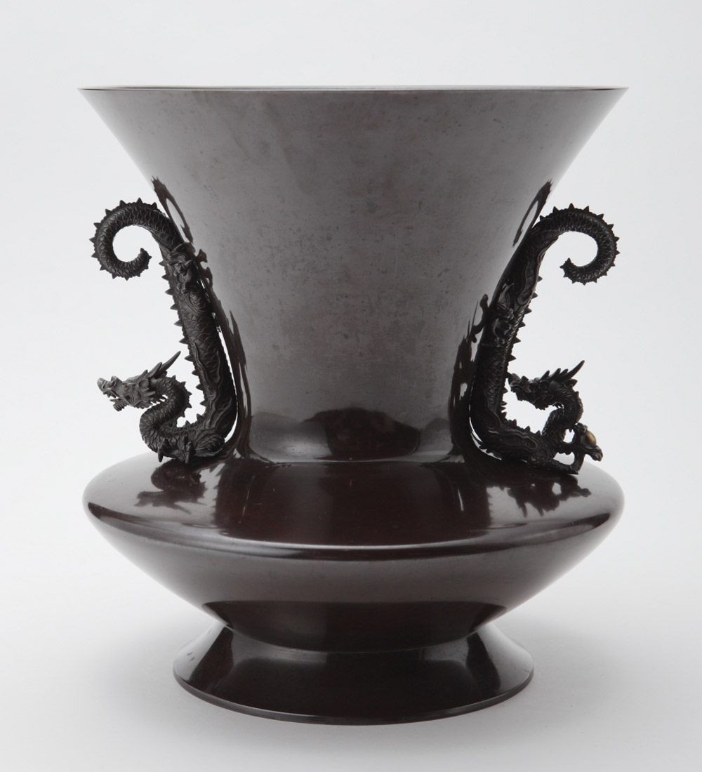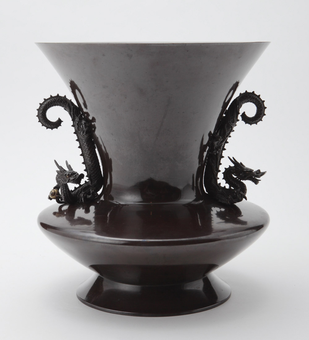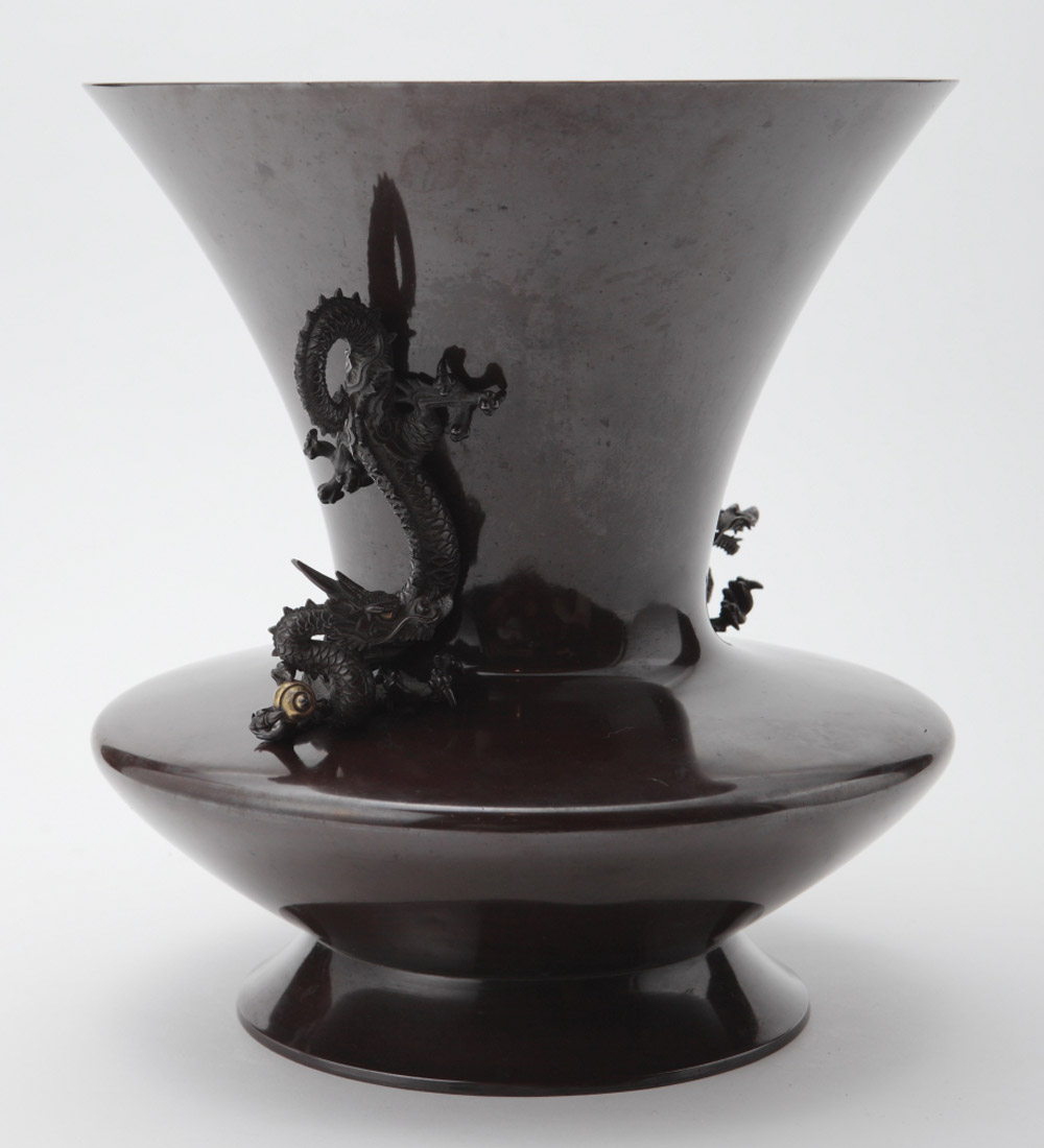 One of the most important metal artists working during the Meiji era, Suzuki Chōkichi was both skilled at metal casting, carving and inlay. His work is often dramatic and ornamental in design, with lavish use of colored metal inlays and rich red lacquer overlays. Born in 1848 in Iruma County of Musashi Province (present-day Sakado City in Saitama Prefecture), Suzuki Chōkichi spent most of his life working in Tokyo. From 1874 until its dissolution in 1891, he was director of the government-sponsored art export company, the Kiritsu Kōshō Kaisha. He exhibited widely at domestic and international exhibitions, including the Paris World Fair Exhibition in 1878 and the Chicago World Fair Exhibition in 1893 (where he exhibited his famous set of twelve falcons). In 1893, Chōkichi was designated an Imperial Court Artist (Teishitsu Gigei-in).