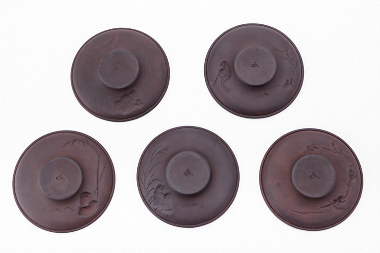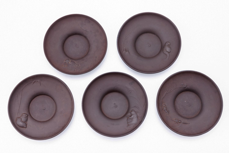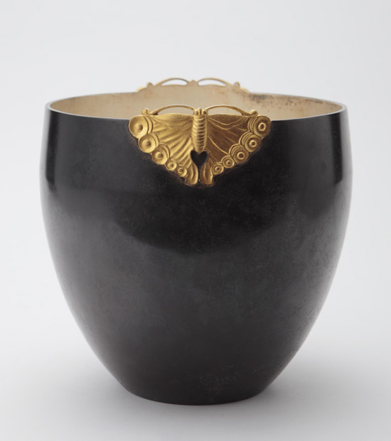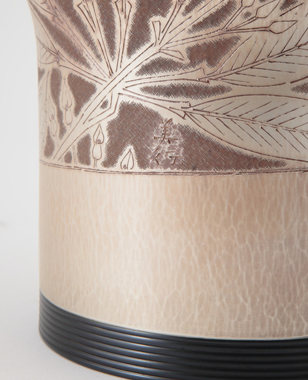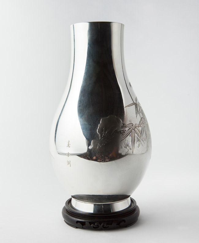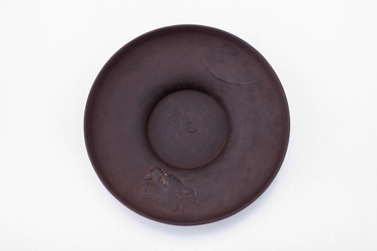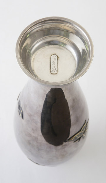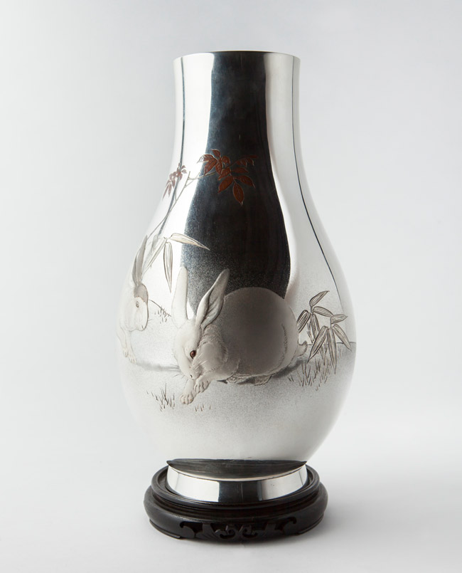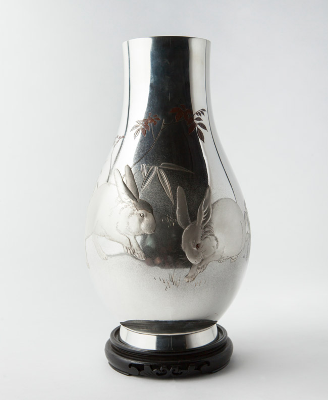 One of the most important metal artists working during the Meiji era, Suzuki Chōkichi was both skilled at metal casting, carving and inlay. His work is often dramatic and ornamental in design, with lavish use of colored metal inlays and rich red lacquer overlays. Born in 1848 in Iruma County of Musashi Province (present-day Sakado City in Saitama Prefecture), Suzuki Chōkichi spent most of his life working in Tokyo. From 1874 until its dissolution in 1891, he was director of the government-sponsored art export company, the Kiritsu Kōshō Kaisha. He exhibited widely at domestic and international exhibitions, including the Paris World Fair Exhibition in 1878 and the Chicago World Fair Exhibition in 1893 (where he exhibited his famous set of twelve falcons). In 1893, Chōkichi was designated an Imperial Court Artist (Teishitsu Gigei-in).