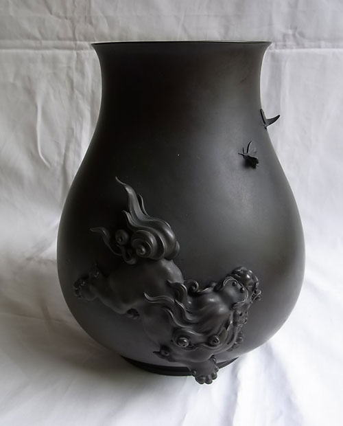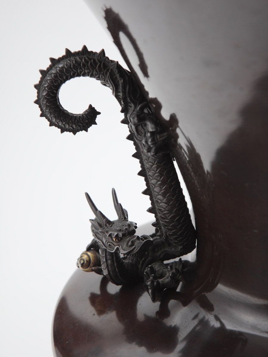 A dragon looks in a pot and will aim at something. I can imagine a story from an expression and a body with the movement of dragon. The dragon is big size for the pot. The direction is unusual and atractive. The inlay of a back and eyes is very beautiful work.