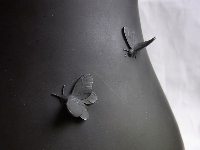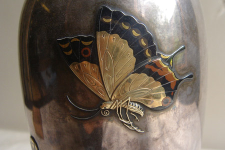 There is not such a delicate and so beautifully butterfly. If there is it, it is famous gold butterfly by Tomiki Muneyoshi. Mr.Mitsuta worked hard at create this time to challenged the gold butterfly. And the completed work was very attractive not only as Jizai but ornament. And I think it must be new masterpiece Jizai okimono of new generation.