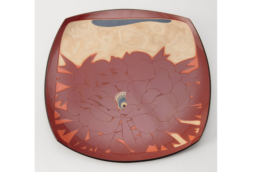 Kōbon or incense tray in a square form. Ornamented with a design of a peacock. Of red,orange,navy blue and beige layered lacquers, carved in chōshitsu technique. With original signed box,
