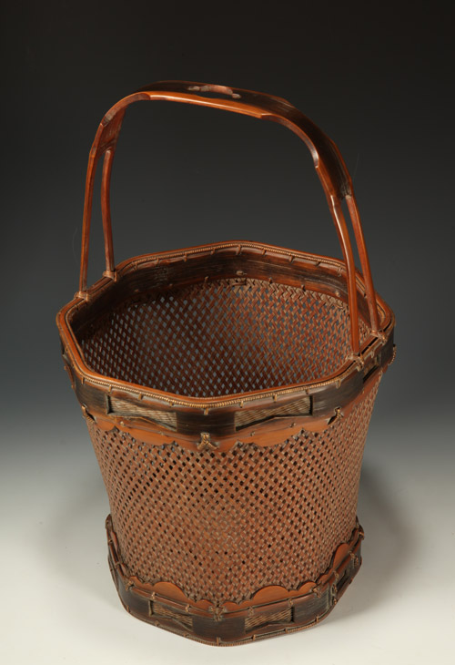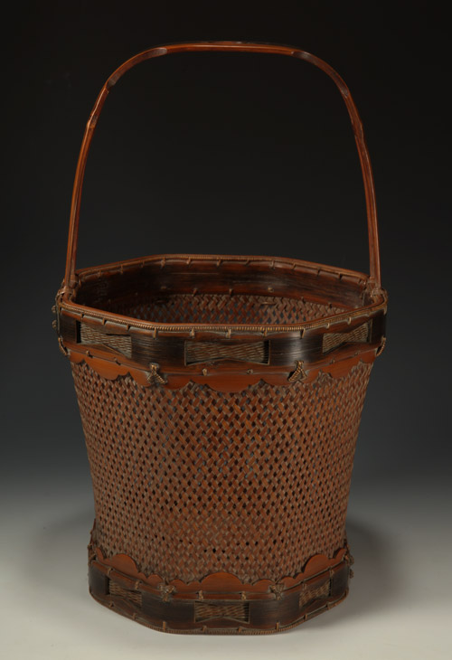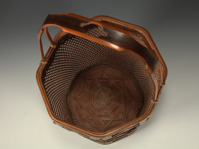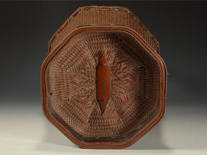 Flower arranging basket in an octagonal form with a loop-style handle. Signed on the reverse with an incised signature by the artist: Hōsai (Iizuka Hōsai II, 1872 - 1934). Shōwa 6 or 1931.